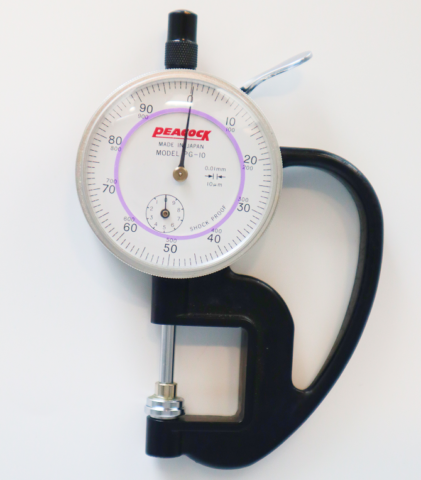 正解は「ペーパーゲージ」。紙の厚みを測る道具です。