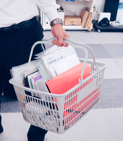 2問目は、社内を行き交う大きなカゴ。その中には書類がぎっしり。
