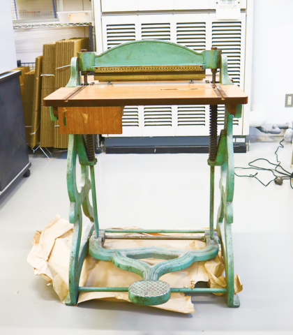 印刷物に“折りスジ”を入れるための機械で、足元のペダルを踏むとピシッとスジが入ります。