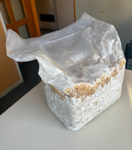 菌床とは「キノコを育てるための土台」のことで、おがくずにきくらげの菌を植え付けています。