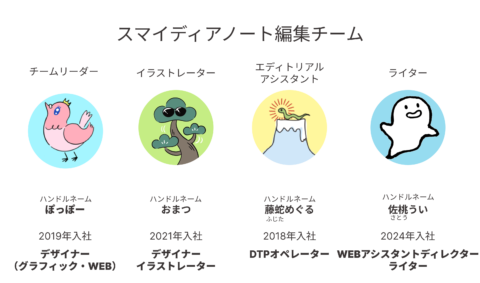 ・ライター・佐桃……1年目ながらWEB業務に携わり、文章力を活かしてスマイディアノートでも成長してほしいと選ばれました